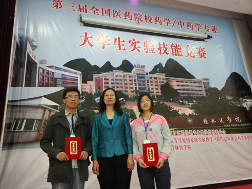 10月27日~28日第三届全国医药院校药学/中药学专业大学生实验技能竞赛暨全国药学/中365bet娱乐场联席会在广西桂林召开。27日上午教育部医药农林处王启明处长、中国药科大学副校长,高等学校国家级实验教学示范中心联席会药学学科组组长姚文兵教授、国家级实验教学示范中心联席会医学组组长、中南大学医学机能实验教学国家级示范中心主任秦晓群教授、中国药科大学药学院院长尤启冬教授分别致辞并作专家报告,27日下午召开全国药学/中365bet娱乐场联席会,我院党委书记、教学院长徐萍教授参加,同时来自全国43所医学院、药学院和中药学院共82名选手参加了第三届全国医药院校药学/中药学专业大学生实验技能竞赛,28日上午举行了颁奖仪式,北京大学药学院2010级李青获得一等奖,2010级李龙获竞赛二等奖。